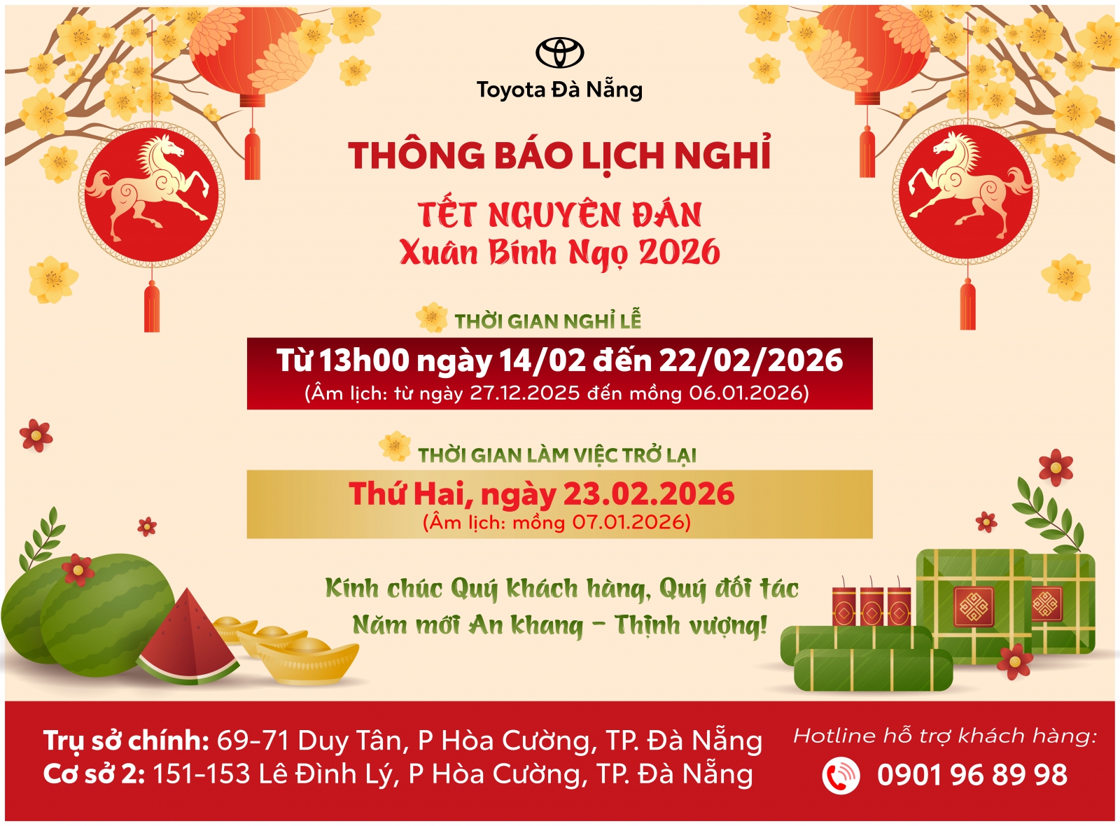 Công ty TNHH MTV Toyota Đà Nẵng trân trọng thông báo đến Quý khách hàng, Quý đối tác lịch nghỉ Tết Nguyên Đán Bính Ngọ 2026 như sau:
